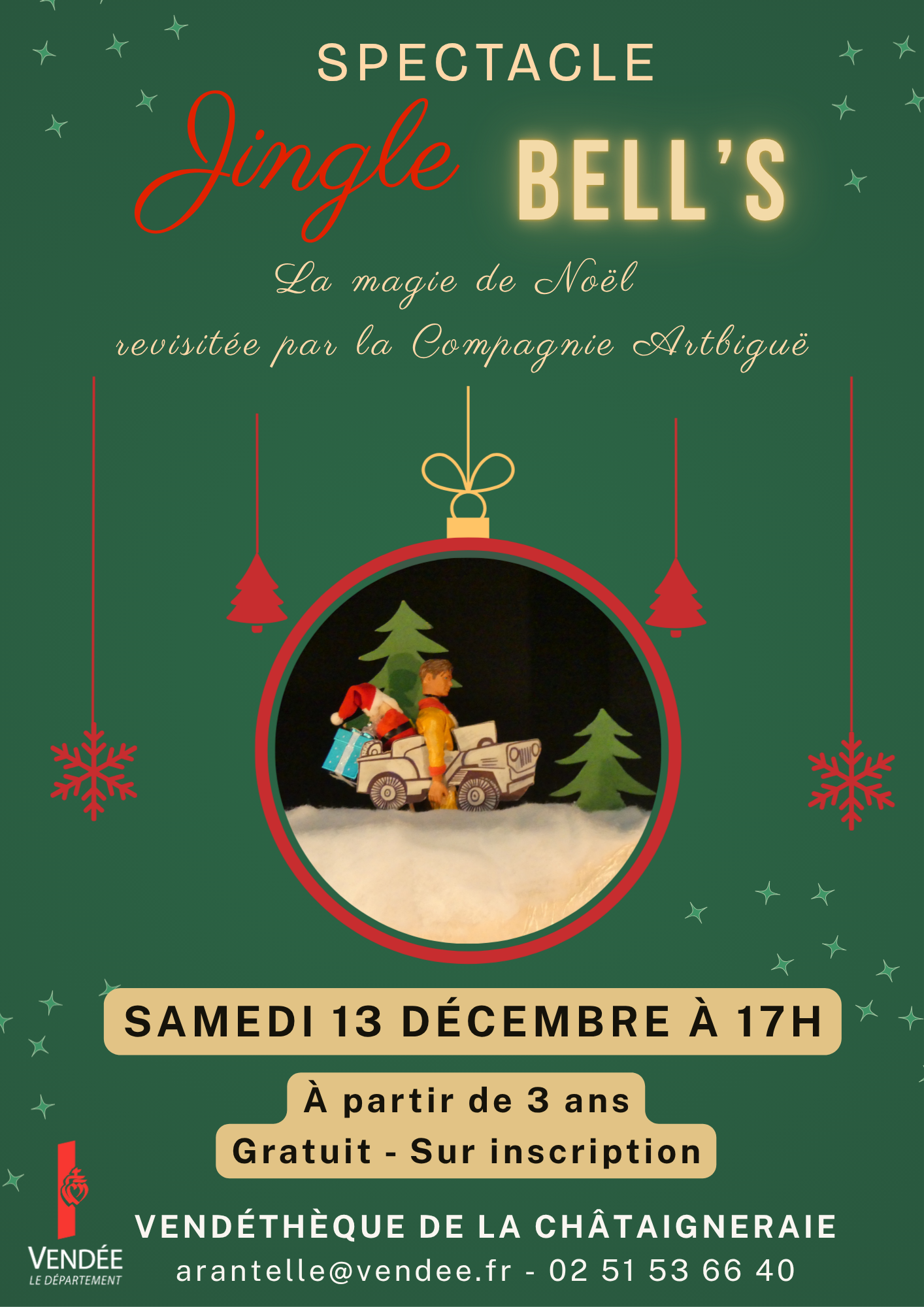 Le Département de La Vendée est heureux de vous présenter à la Vendéthèque de La Châtaigneraie, le spectacle de Noël « Jingle Bell’s » par la Cie Artbiguë.