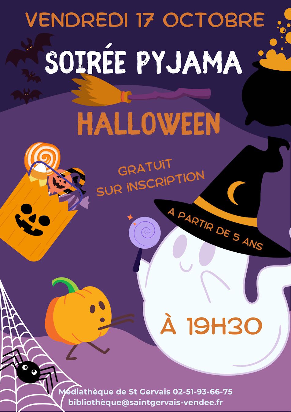 Soirée pyjama "Halloween" Soirée pyjama "Halloween" Le vendredi 17 octobre 2025 de 19:30 à 21:00 Ical Condition d'accès A partir de 5 ans - Sur inscription (02 51 93 66 75 ou bibliotheque@saintgervais-vendee.fr) - Places limitées - Gratuit - Les enfants doivent être accompagnés d'un adulte Lieu SAINT GERVAIS Voir le détail de l'événement