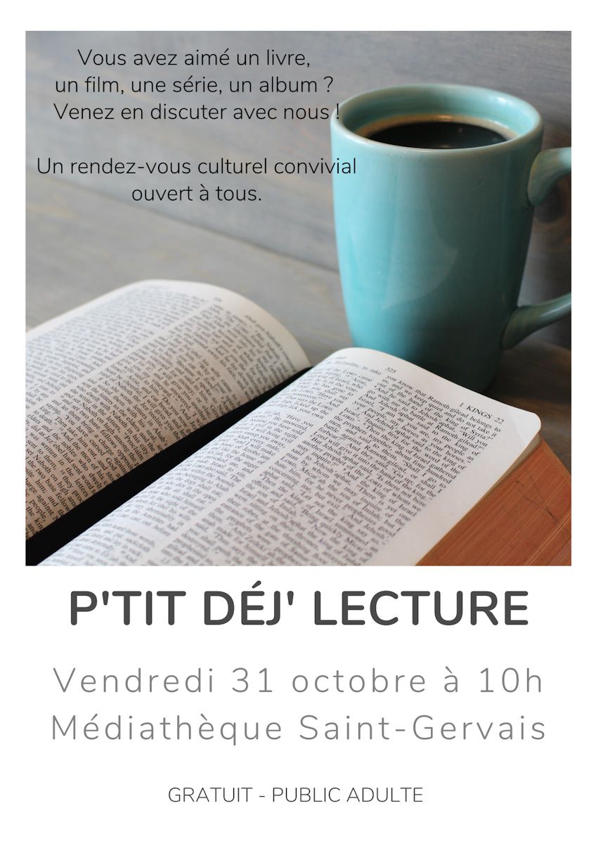 P'tit Dej' Lecture P'tit Dej' Lecture Le vendredi 31 octobre 2025 de 10:00 à 11:30 Ical Condition d'accès Inscription obligatoire (02 51 93 66 75 ou bibliotheque@saintgervais-vendee.fr) - Places limitées - Gratuit Public Adultes Lieu SAINT GERVAIS Voir le détail de l'événement